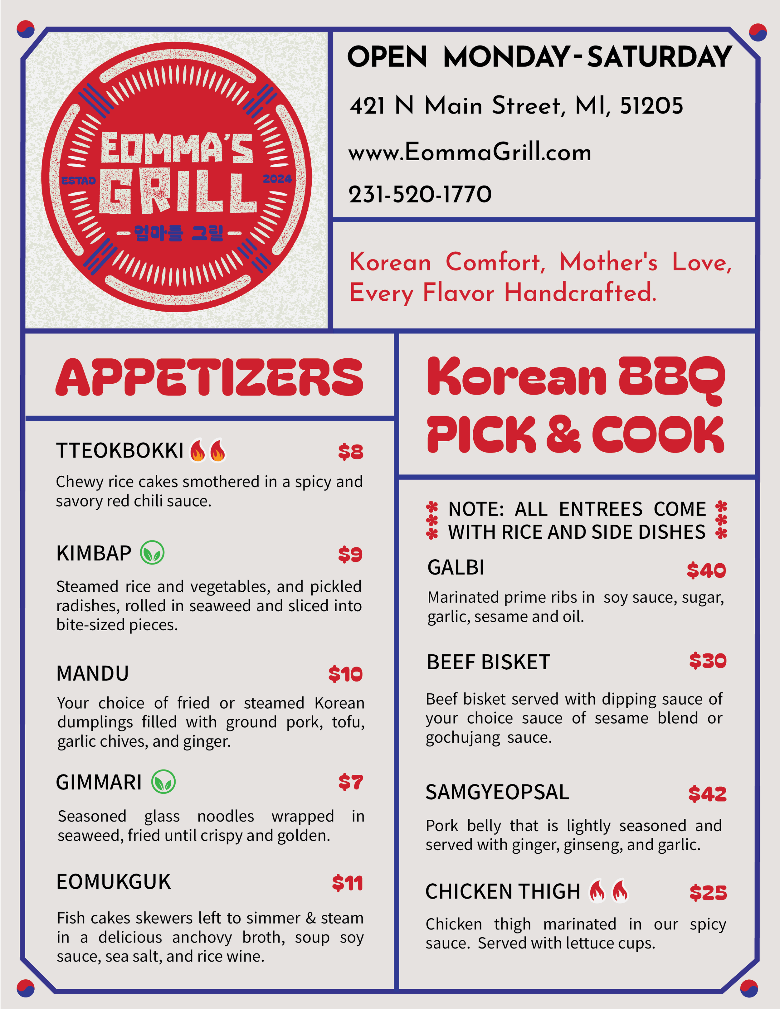 Description: Eomma’s Grill, a Korean grill is a culinary haven that specializes in authentic Korean BBQ, offering a taste of home-cooked comfort straight from the kitchen of a Korean mother. With a dedication to preserving tradition and flavor, this eatery embodies the warmth and hospitality of Korean culture. Every dish is crafted with love and expertise, showcasing the rich tapestry of flavors and textures that define Korean cuisine. From sizzling bulgogi to succulent galbi, each bite tells a story of heritage and family recipes passed down through generations. The atmosphere is alive with the aroma of grilling meats and the laughter of patrons, creating a welcoming ambiance that feels like stepping into a Korean household. With every meal, guests are invited to experience the genuine warmth and authenticity of Korean comfort food, making memories that linger long after the last bite.